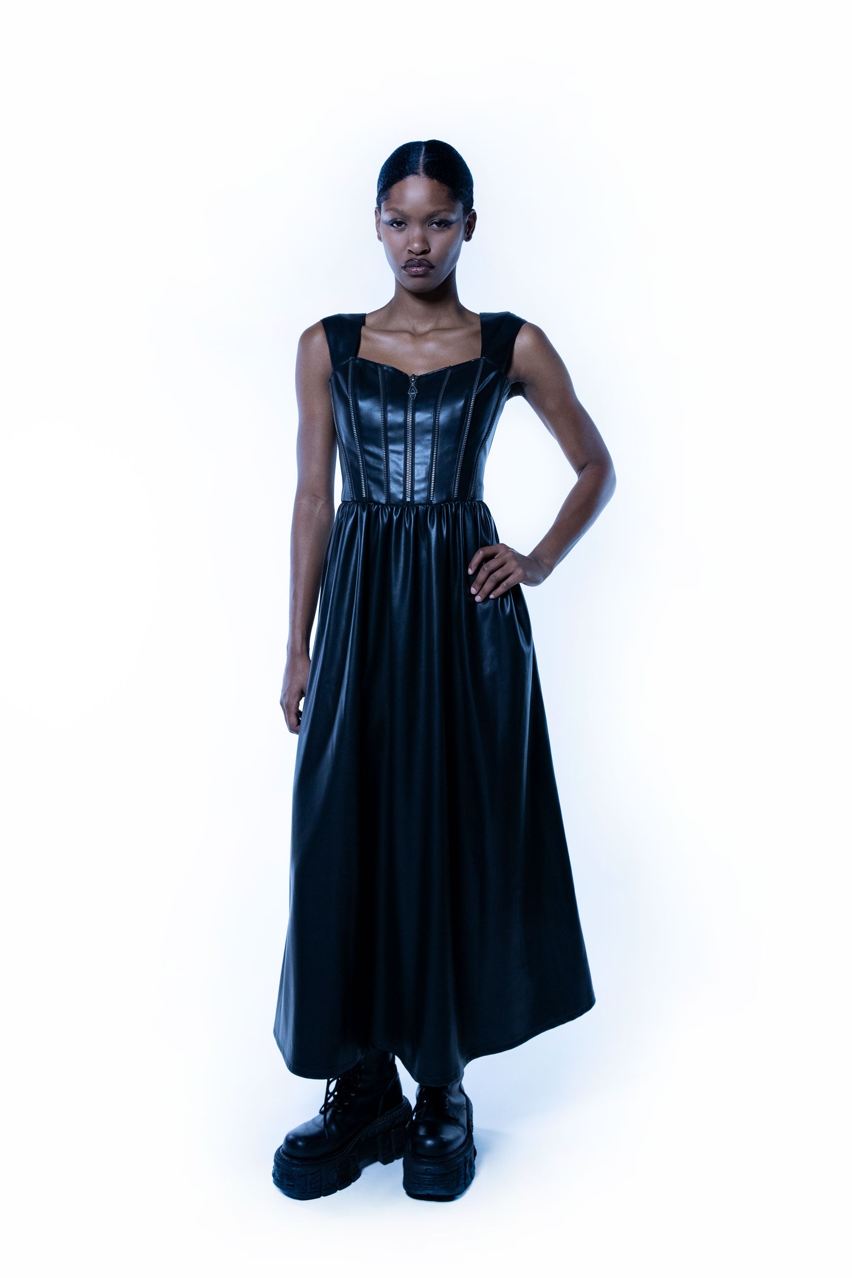 A symphony of rebellion and grace, the Ignis Dress transforms tradition into a bold statement. Draped in smooth vegan leather, its structured bodice embraces strength, while the flowing skirt whispers of elegance. Antique silver hardware and a signature logo zipper pull glint like armor, a quiet nod to resilience. This is a piece for those who walk between shadows and light, where old-world charm is reborn with modern fire.